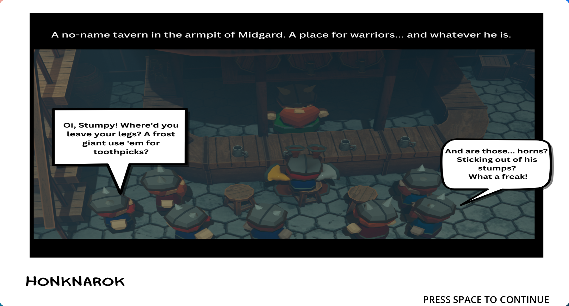 Honknarok is a short, physics-based rage game set on a treacherous mountain path to Valhalla. You don’t use legs, climbing axes, or jetpacks - instead, you control 4 powerful horns grafted to your torso. By charging the correct horn, you blast sound in one direction to launch yourself in the other.